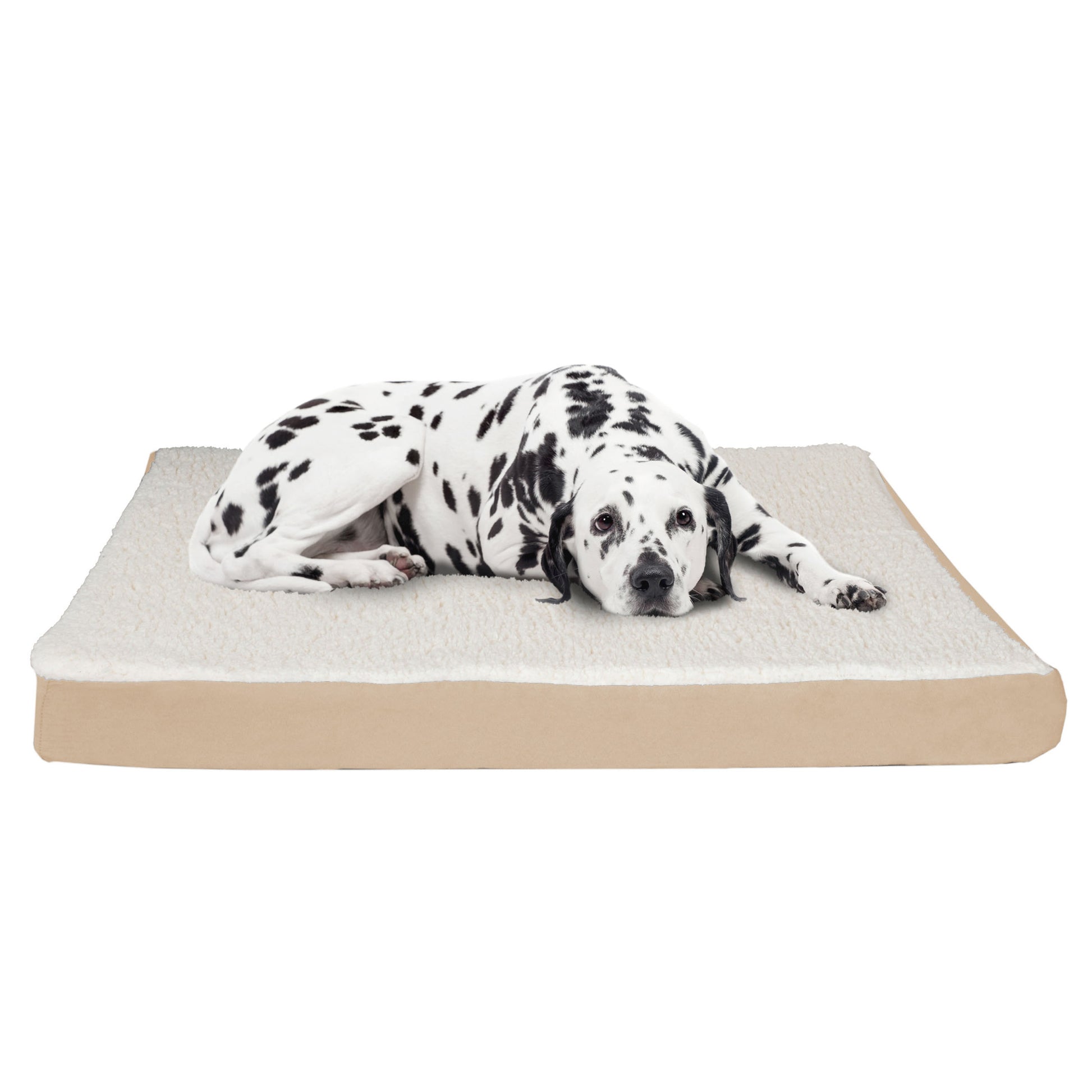 - The dog bed features memory foam at the base, high-density foam on top, and is topped in washable fuzzy Sherpa fabric for maximum comfort