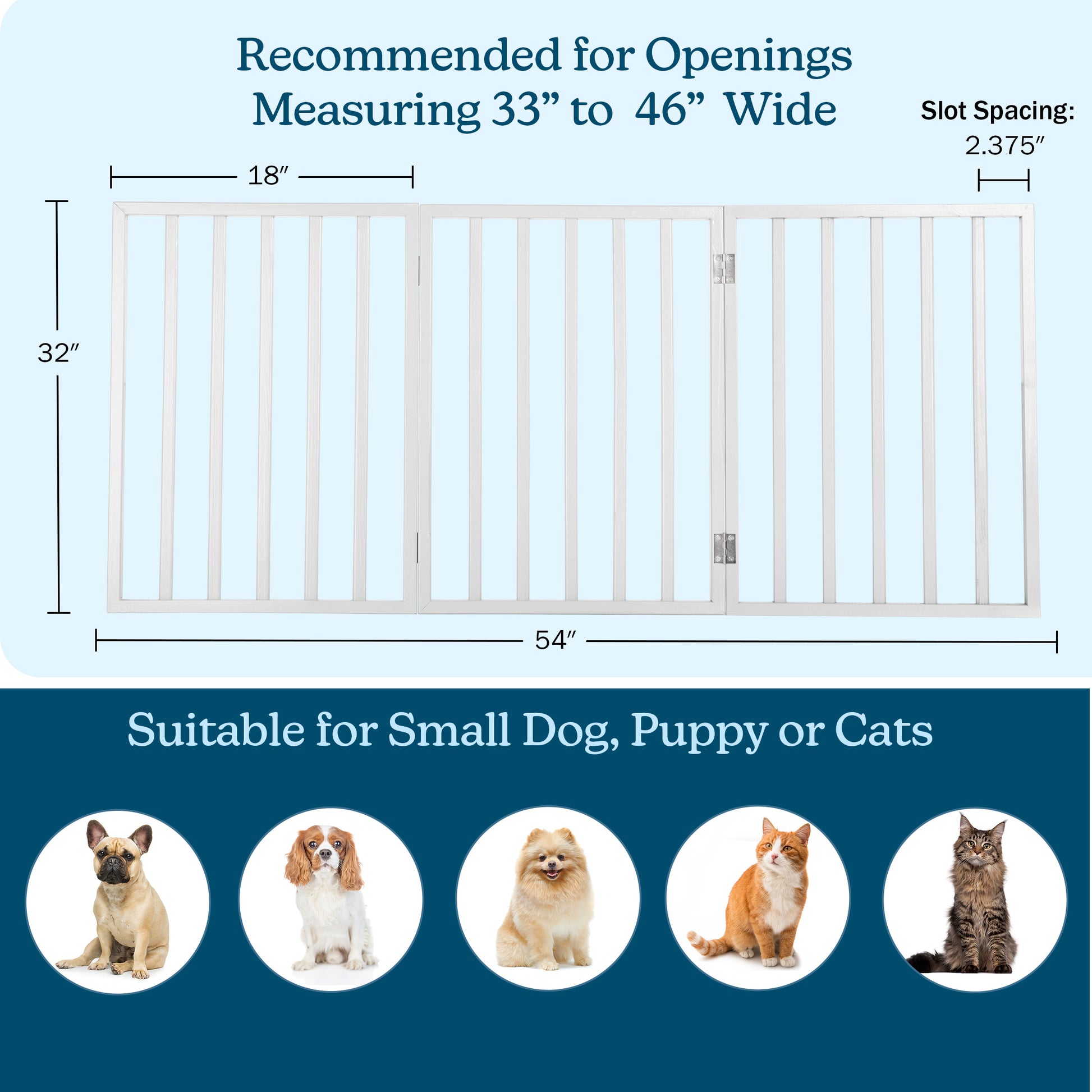 - This versatile free standing pet gate is ideal for use in doorways, at the top or bottom of stairways, in hallways, or any indoor openings 33 to 46-inches-wide