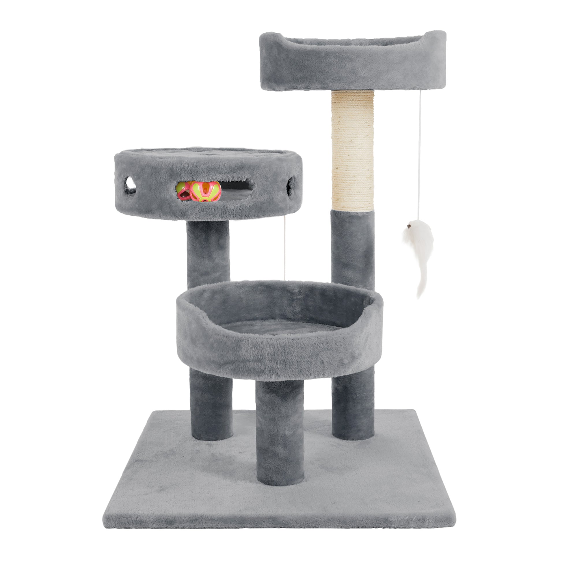 Give your cat or kitten the perfect place to sleep, scratch, and play with this 27.5-Inch Tall Cat Tree by PETMAKER. Featuring a carpeted base, two perches with raised edges for napping, a sisal rope cat scratching post, a dangling mouse toy, and an interactive cheese wheel with three balls inside, these cat towers provide your cat with the thrill of hunting while indoors. The light gray color and vertical design help this cat tower for large cats complement most home décor and fit in smaller spaces, while the cat scratch pad deters your pet from using your furniture to sharpen and trim their nails.