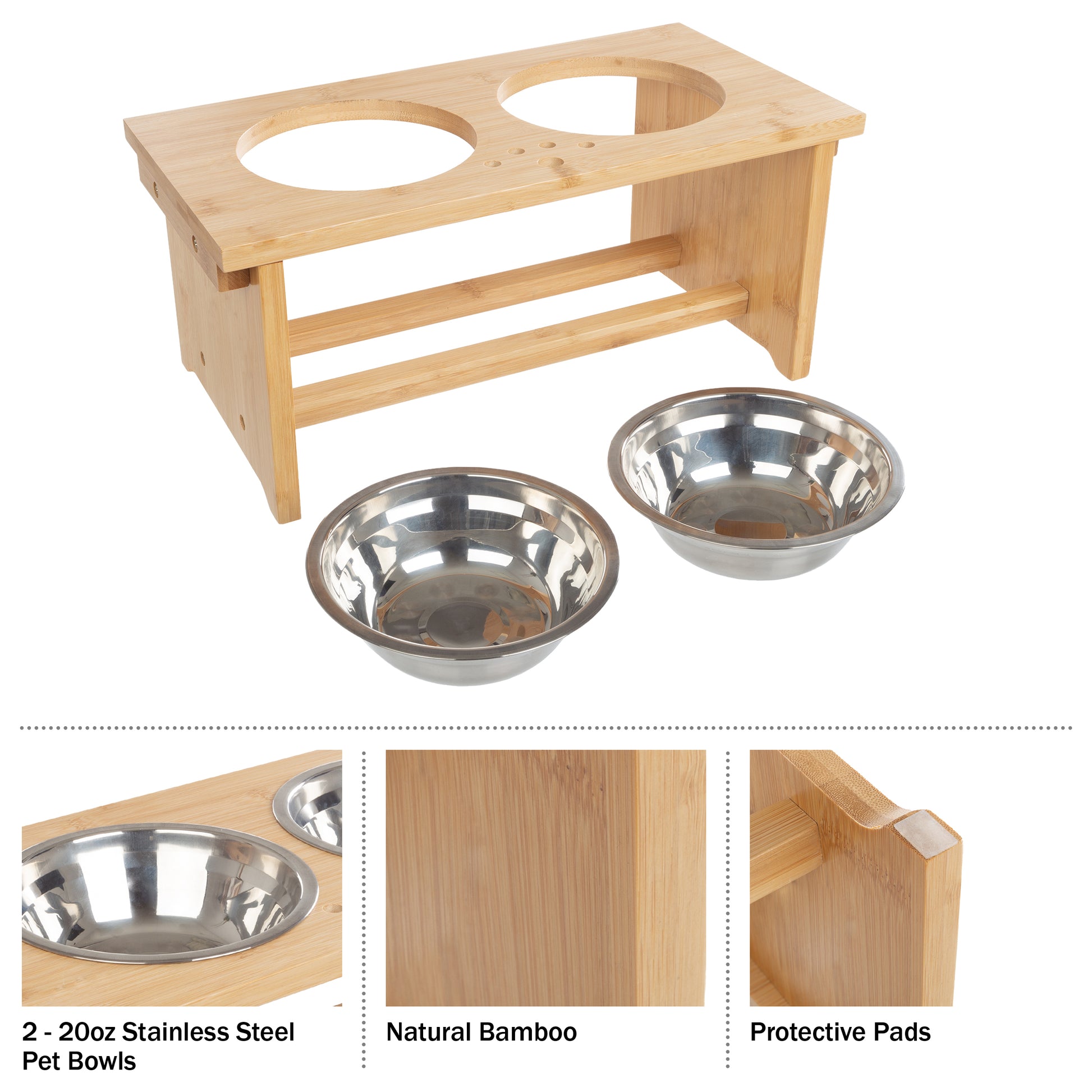 - This pet feeder is made of natural durable bamboo with nonslip feet, and the dog food bowls are made of stainless-steel that is rust-resistant for long lasting use