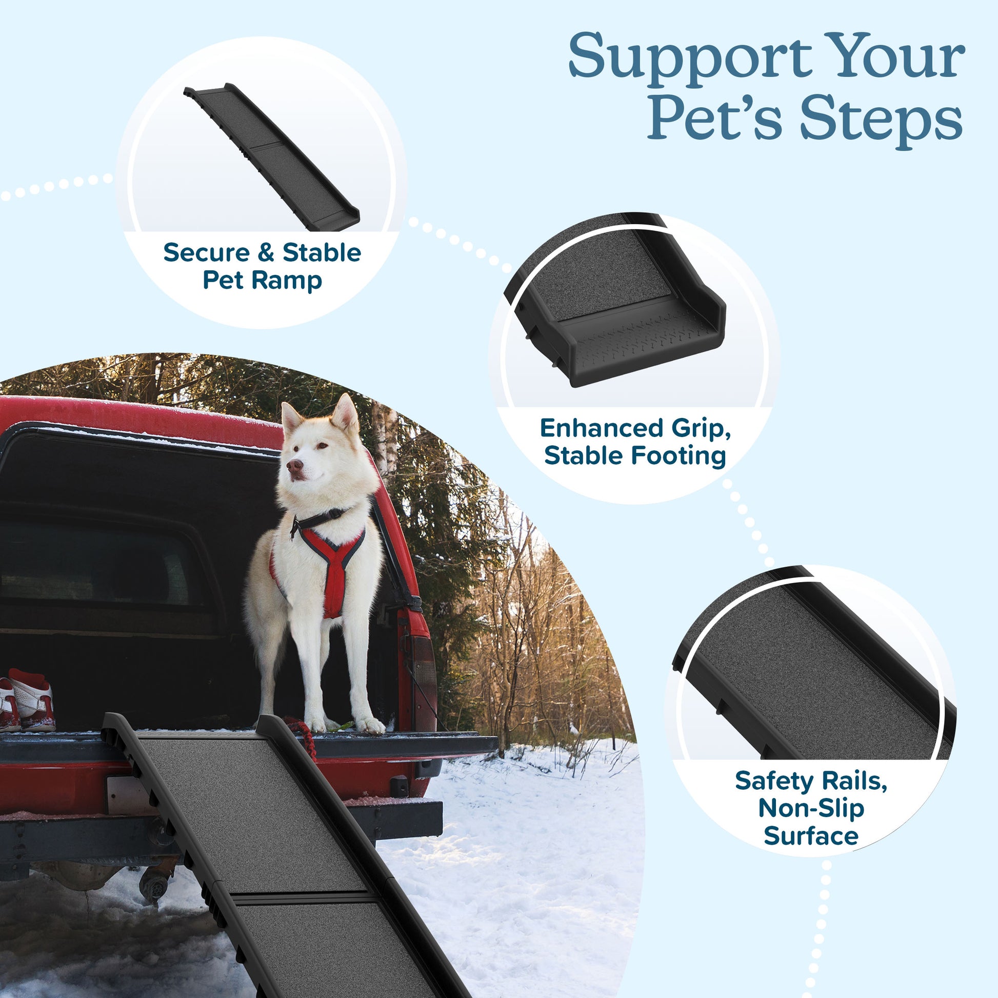 Give your furry pal a safe and secure way to get in or out of your truck, car, SUV, or RV with the Dog Ramp by PETMAKER. Each 61-inch-long pet ramp features a safety latch to keep it closed and a nonslip surface with raised sides to ensure your puppy, injured pet, or senior dog with arthritis has a secure footing while walking in or out of your vehicle. Made of durable polypropylene plastic, this outdoor dog ramp supports dogs weighing up to 150lbs and is easy to set up in seconds or fold away for compact storage or travel.