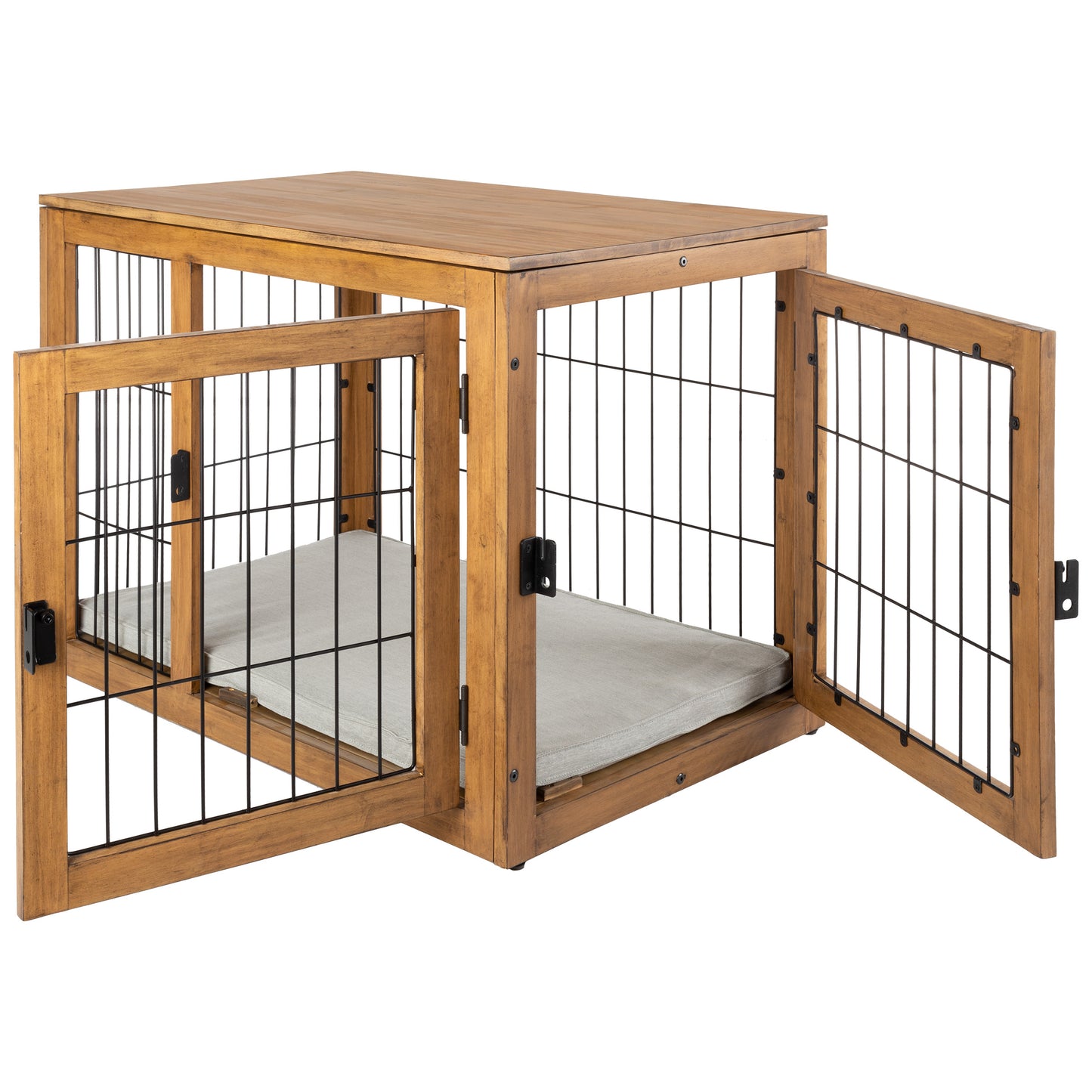 The Large Dog Crate by PETMAKER provides training, containment, and a home for your furry friend while also serving as an end table, side table, or nightstand. This attractive dog house is made of metal bars and durable acacia wood with a wide top so you can display home decor, lamps, framed pictures, plants, and more while your pet rests comfortably underneath. The dog crate furniture features two doors, allowing for front and side access, a 1-inch cushioned pad that is removable for easy cleaning, and a 360-degree open view so your dog can see you and get plenty of ventilation. This decorative dog crate is made to blend seamlessly in with your existing apartment, bedroom, or living room décor for a cohesive look.