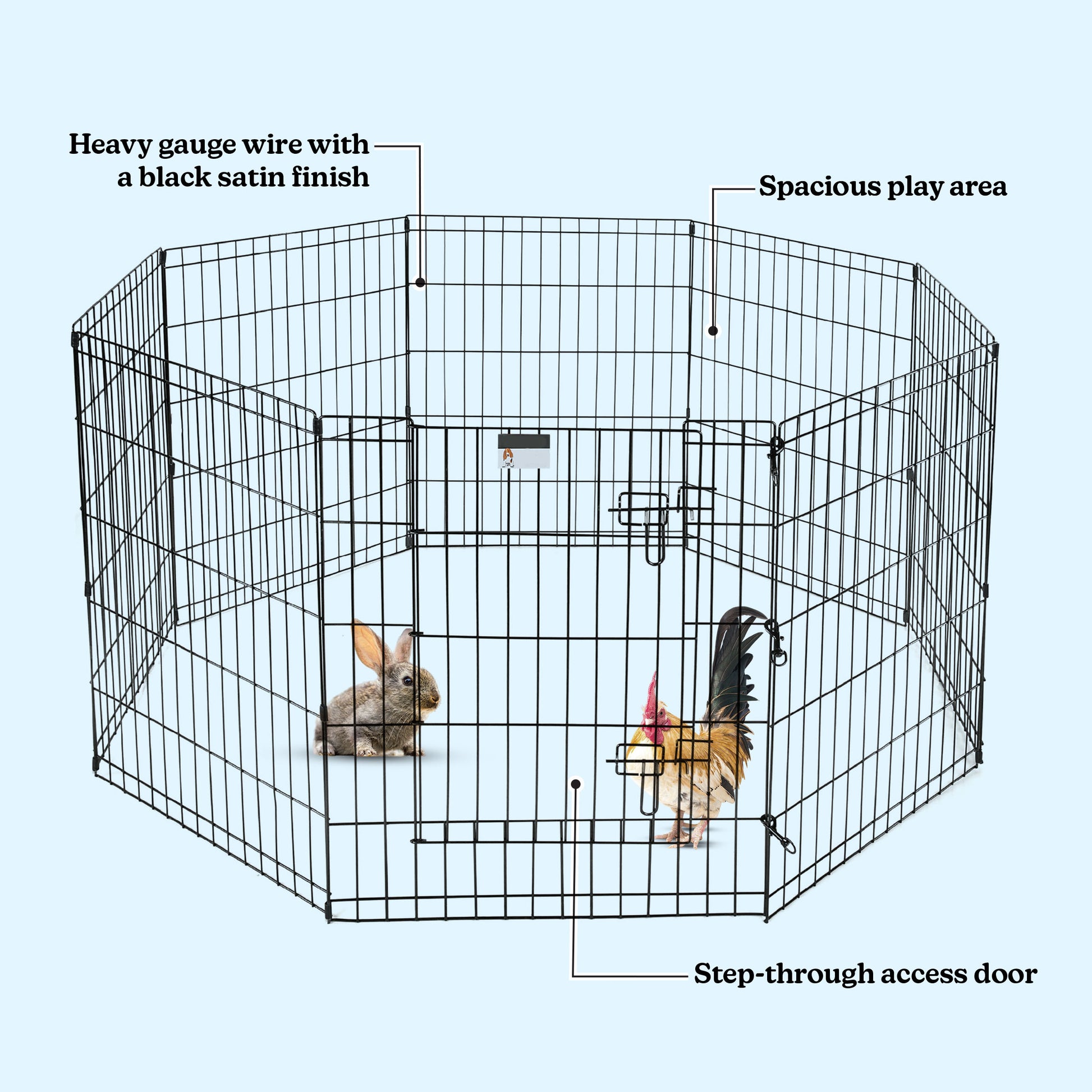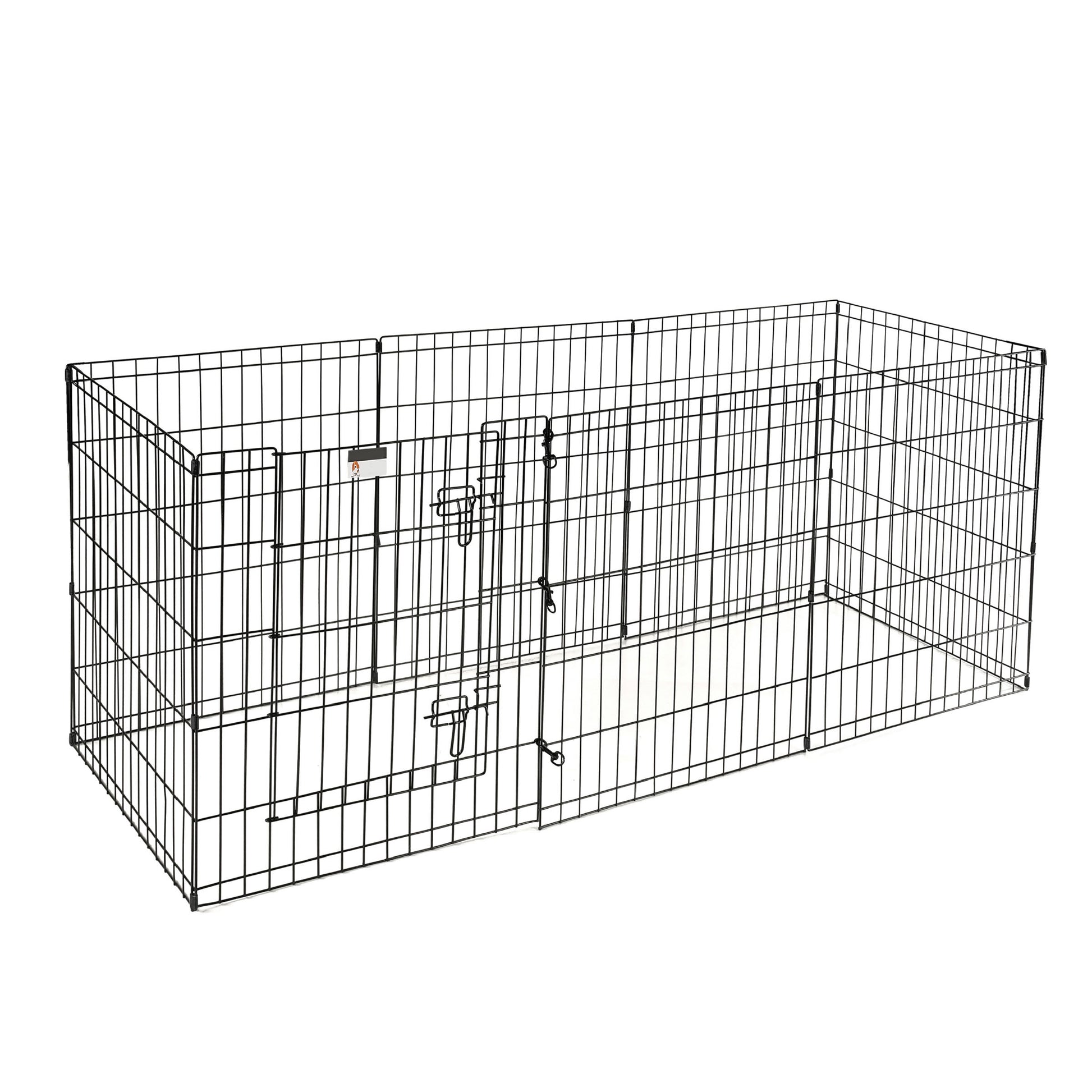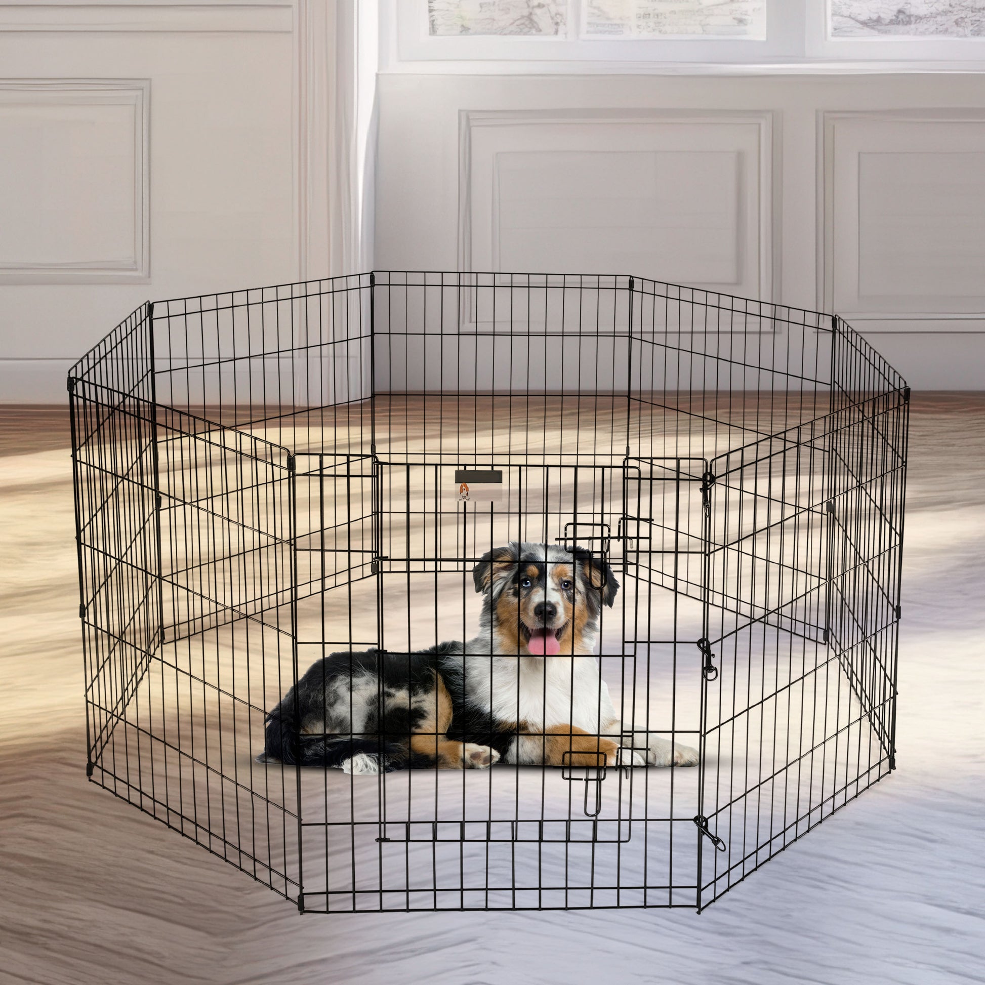 The Playpen by PETMAKER provides a great enclosure to keep your small pets safe and secure indoors or out. The dog kennel has 8 connected 24x30-inch panels to create a spacious play area for puppies, small dogs, cats, rabbits, guinea pigs, chinchillas, large turtles, or any appropriately sized pet up to 25lbs. The dog fence is made of heavy gauge wire with a black satin electro-coat finish for long-lasting protection against the elements, and it's equipped with a secure door with double latches for easy access. The foldable design of this dog cage allows you to set it up in multiple configurations and can fold flat for compact storage and portability, making it the perfect addition to your puppy essentials.