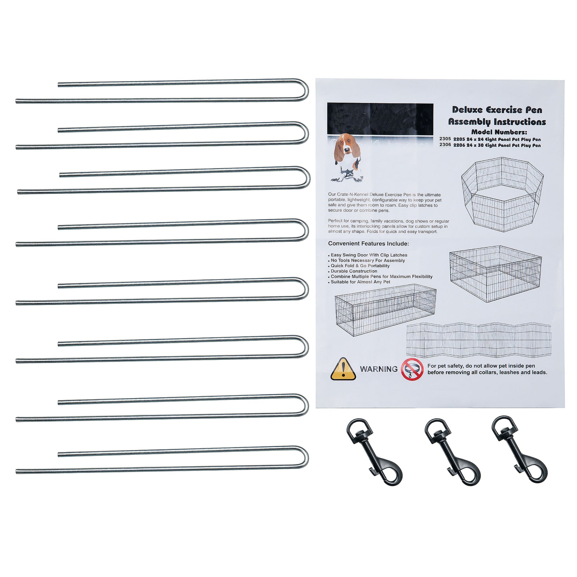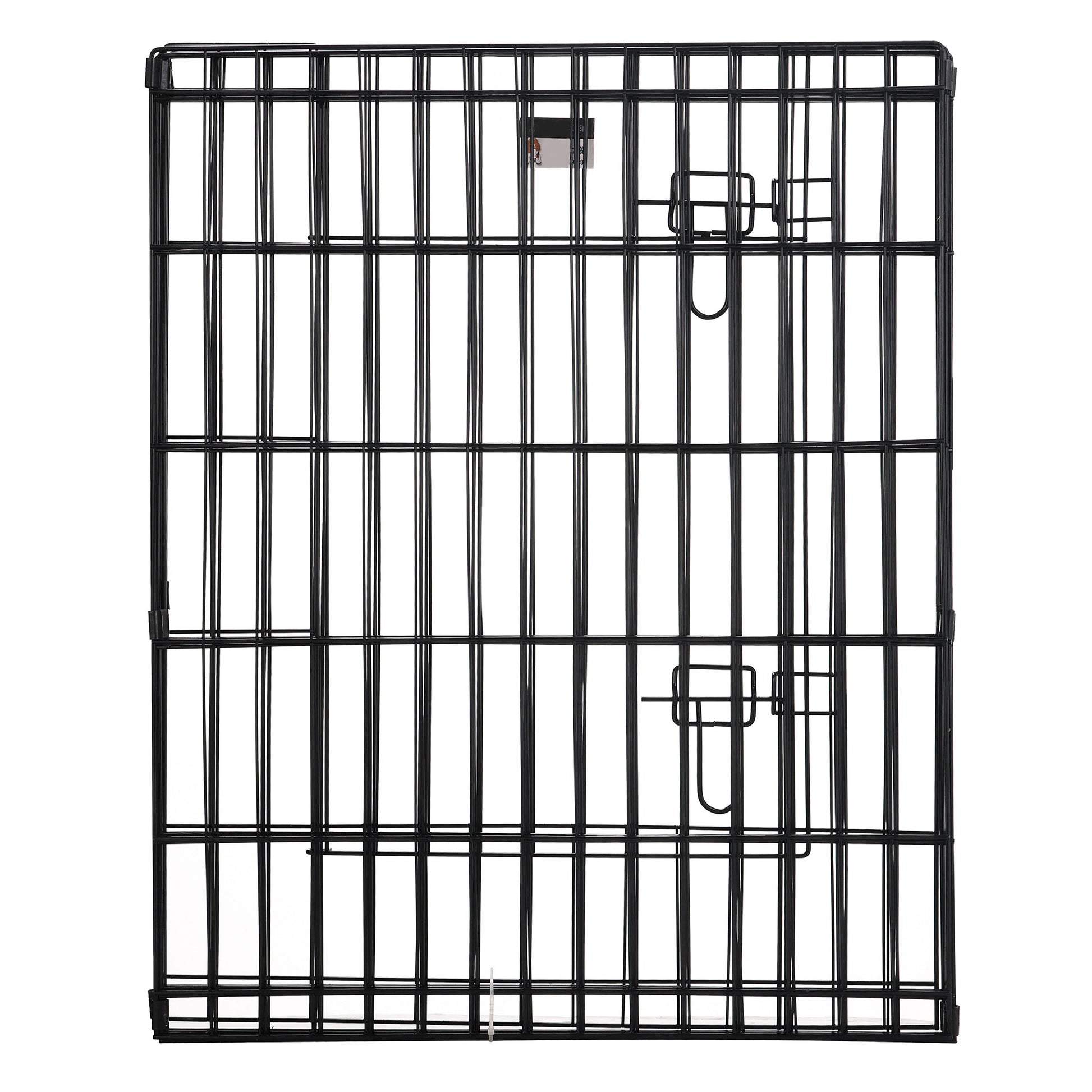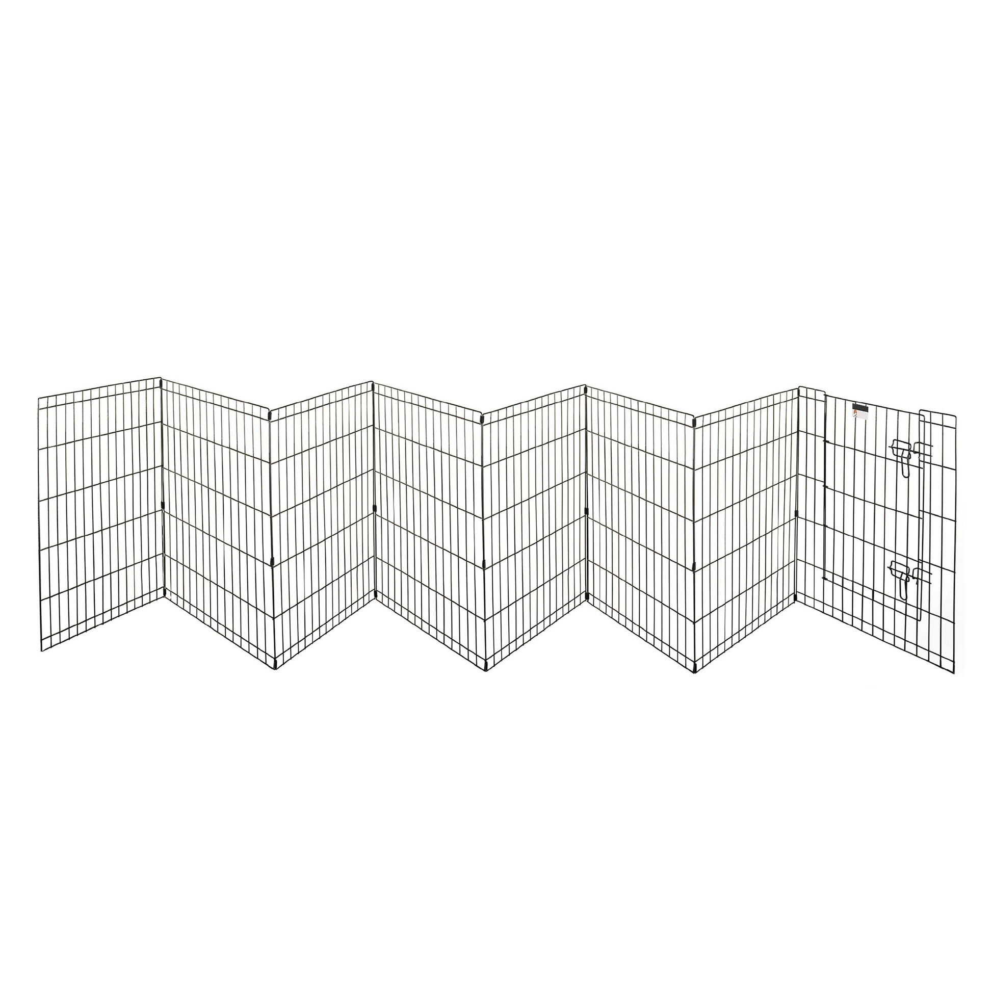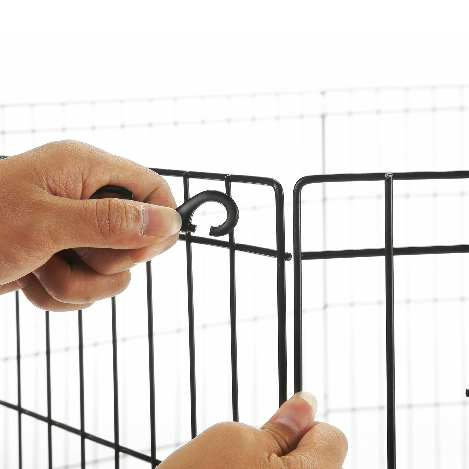 The Playpen by PETMAKER provides a great enclosure to keep your small pets safe and secure indoors or out. The dog kennel has 8 connected 24x30-inch panels to create a spacious play area for puppies, small dogs, cats, rabbits, guinea pigs, chinchillas, large turtles, or any appropriately sized pet up to 25lbs. The dog fence is made of heavy gauge wire with a black satin electro-coat finish for long-lasting protection against the elements, and it's equipped with a secure door with double latches for easy access. The foldable design of this dog cage allows you to set it up in multiple configurations and can fold flat for compact storage and portability, making it the perfect addition to your puppy essentials.