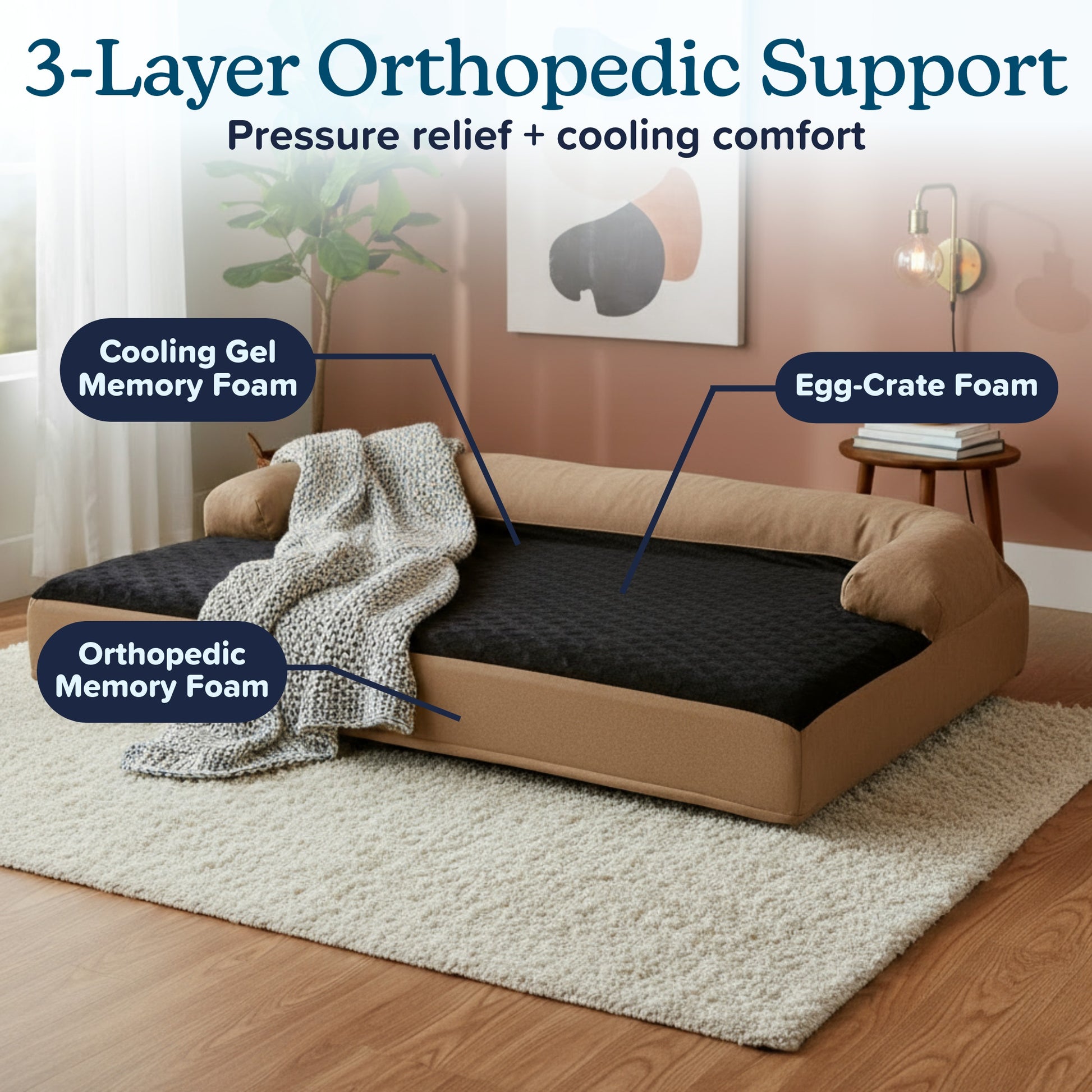 With a triple layer foam construction, the Sofa Dog Bed by PETMAKER is designed with comfort in mind. This sofa style chew proof dog bed offers a plush memory foam bolster to cushion and support your pet's neck, while a removable microsuede cover is easy to clean and provides smooth softness. The large dog sofa for large dogs also features a 3-inch layer of orthopedic memory foam at its base, plus a 1-inch-thick layer of egg crate style memory foam that helps distribute their weight evenly to limit pressure points. A cooling gel memory foam topper provides additional cushioning and keeps your pet cool as they rest, and a non-skid backing keeps the dog couch stable and secure.